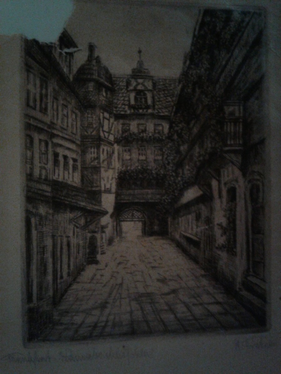 Many years ago, (23 to be sure,) a close neighbor passed away. She had no children and her closest relative was overseas. So he received the inheritance and the neighbors received the job of cleaning out her apartment. Because I was a favorite neighbor of this woman from my childhood, I received two pencil-sketched pictures of German street scenes.