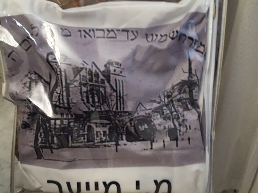 I ordered a custom throw pillow (stuffing not included) on Amazon for 6$. It ships from Asia so allow time for delivery. I bought a plastic cover at Eichler’s and for another 6 dollars. I have a picture of the old shul on Friedberg Anlage with the posuk “Mimizrach Shemesh ad Mevo’o” …ממזרח שמש עד מבואו מהלל שם” From the rising of the sun to the place where it sets, the name of Hashem is to be praised.”(Ps. 113:3)